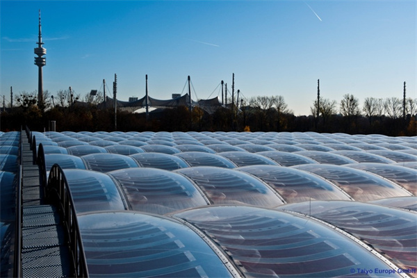 卓越的透光性 – ETFE薄膜可以高度透明,并允許紫外線通過,紫外線負(fù)責(zé)促進(jìn)光合作用,從而促進(jìn)植物生長。太陽能控制/遮陽 – ETFE薄膜系統(tǒng)可在一層或多層上加入多種玻璃料圖案,以改變其太陽能性能。箔片印有各種標(biāo)準(zhǔn)或定制圖案。顏色可以通過各種方式引入,無論它是在薄膜擠出過程中應(yīng)用,提供從紅色到紫色的各種色調(diào)的一致色調(diào),或添加無限顏色選項(xiàng)的照明。彈性 – 雖然ETFE薄膜非常有彈性,但它們?nèi)跃哂薪Y(jié)構(gòu)抗性。彈性/塑性極限的拉伸強(qiáng)度為21-23N /mm 2,但斷裂點(diǎn)的拉伸強(qiáng)度為52/Nmm 2。對(duì)于膜結(jié)構(gòu)計(jì)算,通常保守地采用15 N /mm的極限。持久耐用 – 長期暴露于環(huán)境污染,紫外線,刺激性化學(xué)品或極端溫度變化,ETFE不會(huì)降解。聲學(xué) – ETFE薄膜具有大約70%的聲學(xué)傳輸可持續(xù)/節(jié)能 – 從薄膜的擠出到運(yùn)輸?shù)浆F(xiàn)場,與其他類似的包覆材料相比,消耗的能量很少,從而減少了整體碳足跡。除此之外,產(chǎn)品的性質(zhì)通過隔熱和采光增強(qiáng)了建筑物理,從而有助于建筑的全球低能耗。成本效益 – 由于ETFE的輕質(zhì)特性,可以更有效地設(shè)計(jì)下部結(jié)構(gòu)支撐系統(tǒng)和混凝土基礎(chǔ)。ETFE系統(tǒng)還提供充足的自然采光,從而通過降低對(duì)室內(nèi)照明的需求來更小化能源成本。可回收 – 易于回收利用,來自制造過程的廢棄物甚至舊的ETFE元件可以重新制成新的ETFE產(chǎn)品,如管道部件,電線或鑄件。
