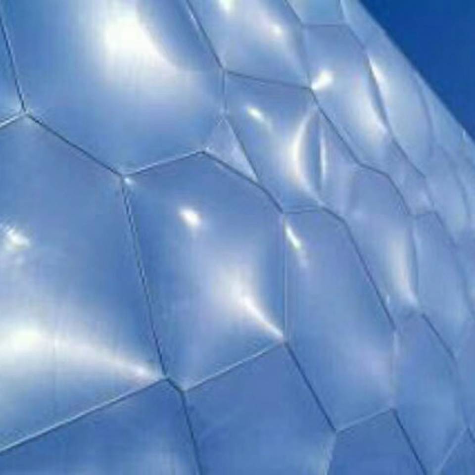 ETFE膜結(jié)構(gòu),為透明白色印花膜,安裝在鋼結(jié)構(gòu)上方,共884塊,總面積近4萬平方米。在ETFE膜下方12米的位置,鋪設(shè)的就是第層膜———PTFE膜,顏色為乳白色,懸空吊在鋼結(jié)構(gòu)上。