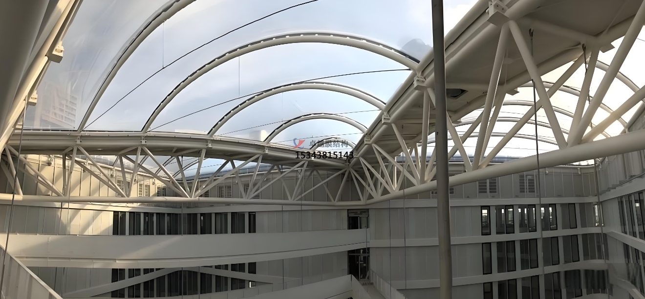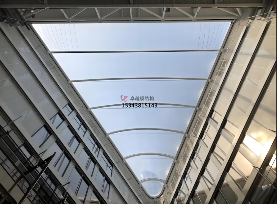 ETFE膜,更大的優(yōu)勢(shì)還在于它們可以加工成任何尺寸和形狀,滿足大跨度的需求,節(jié)省了中間支承結(jié)構(gòu)。作為一種充氣后使用的材料,它可以通過控制充氣量的多少,對(duì)遮光度和透光性進(jìn)行調(diào)節(jié),有效地利用自然光,節(jié)省能源,同時(shí)起到保溫隔熱作用。