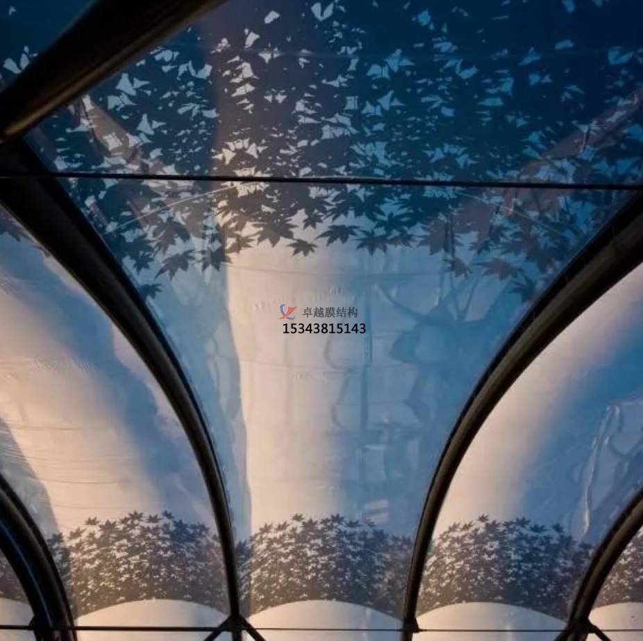 這里主要說一下使用最廣泛的透明加花紋鍍點膜。在透明膜上增加花紋鍍點,目的是調(diào)節(jié)陽光的通過率,使屋面下的光照環(huán)境更舒適宜人。鍍點花紋的形狀、大小、排布間隔等,都是可以定制的。雖然膜材上加了鍍點,但是當屋面離地面10米以上時,視覺中,鍍點屋面看起來幾乎是透明的。