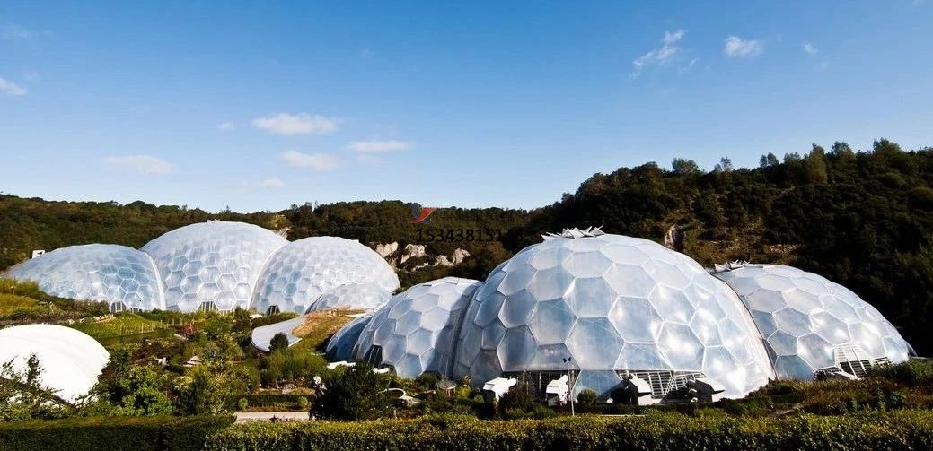 “伊甸園”項目位于英國的康沃爾郡,是在廢棄的礦山上建的全球最大的生態(tài)溫室。主要由8個充滿未來主義色彩的巨大蜂巢式穹頂建筑構(gòu)成,其中每4座穹頂狀建筑連成一組。“伊甸園”的穹頂穹頂架由鋼管構(gòu)成,拼成尺寸9米大小的六角形天窗,天窗中間鋪設半透明的ETFE薄膜材料。在形態(tài)上像放大了無數(shù)倍的“大水泡”。"大水泡"里培育著原產(chǎn)于非洲、亞洲、歐洲、大洋洲和美洲的熱帶植物。