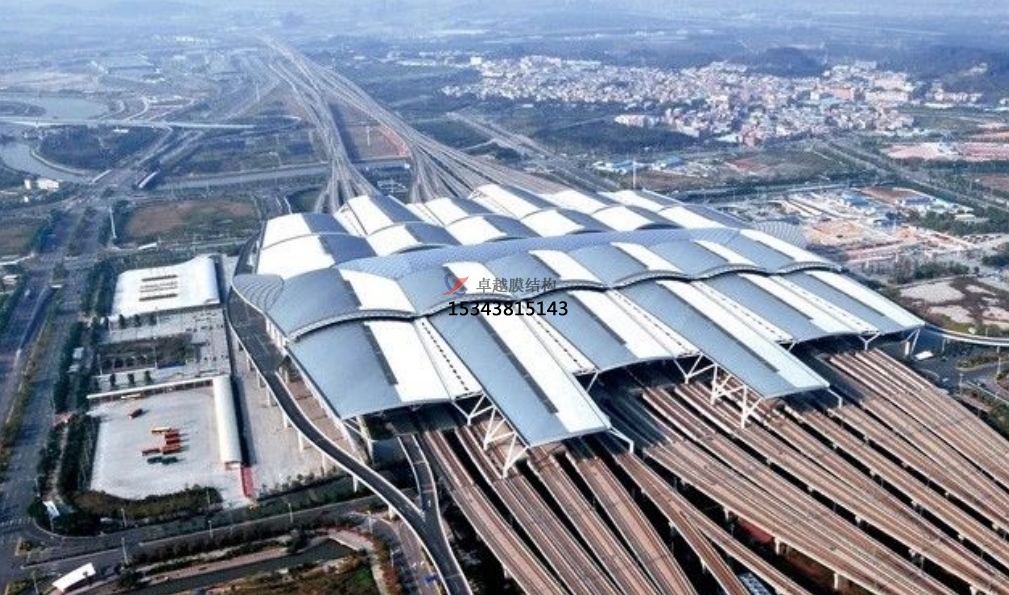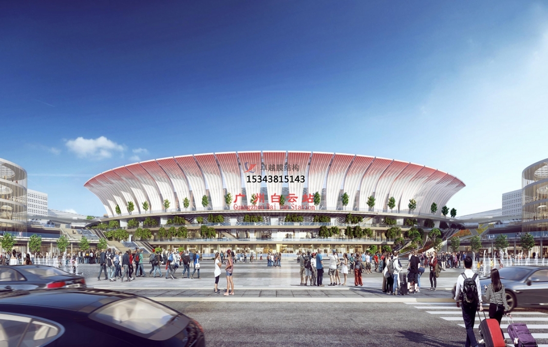 廣州白云站彩色PTFE膜結(jié)構(gòu)項目,單個膜花瓣單元采用白色和彩色膜材拼接技術(shù)。結(jié)構(gòu)上采用上下起伏的花蕾構(gòu)造,這使得膜材在張拉過程中,需要充分考慮摩擦對本項目預(yù)張力施加的困難。同時因為單個裁剪單元細(xì)長,寬度最寬約1.2m,長度大37m,其沿線長度方向整體需要焊接,所以焊接的應(yīng)力對本項目的影響尤為明顯。針對以上難點,膜材進(jìn)場后,采用最先進(jìn)的雙軸拉伸設(shè)備對本項目的膜材進(jìn)行詳細(xì)的應(yīng)力與應(yīng)變關(guān)系的測試實驗,確保每一批次,每一張膜材在后期焊接接張拉過程中受力均勻,形態(tài)完美。