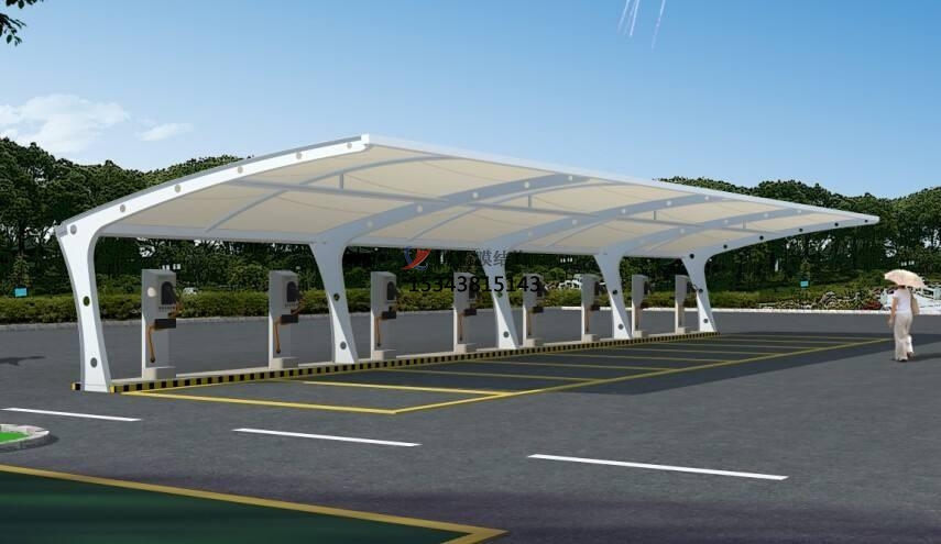 3.商業(yè)廣場雨棚搭建頂部的密封板加蓋有棕褐色(顏色可選擇)日光板,與棚整體框架用分層鉚接固定,耐酸堿腐蝕,有足夠的強度維持棚內(nèi)車輛。