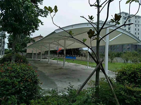 膜結(jié)構(gòu)車(chē)棚,是以建筑織物,即膜材料為張拉主體,與支撐構(gòu)件或拉索共同組成的結(jié)構(gòu)體系,它以其新穎獨(dú)特的建筑造型,良好的受力特點(diǎn)——成為大跨度空間結(jié)構(gòu)的主要形式之一。膜材料是指聚酯纖維基布或PVDF、PVF、PTFE等不同的表面涂層,配以?xún)?yōu)質(zhì)的PVC組成的具有穩(wěn)定的形態(tài),并可承受一定載荷的建筑紡織品。它的壽命因不同的表面涂層而異,一般可達(dá)成10-20年。
