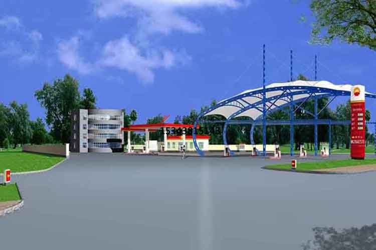 二、加油站頂棚并不是傳統(tǒng)意義上的一個遮陽擋雨的覆蓋頂棚,隨著人們審美的不斷提高,除了要求頂棚具有實用性功能外,還要有一定的美觀性,因此,在充分發(fā)揮膜布的性能條件下,搭配先進的張拉技術(shù),可以將頂棚張拉成不同的形狀,使加油站更具有藝術(shù)美感。