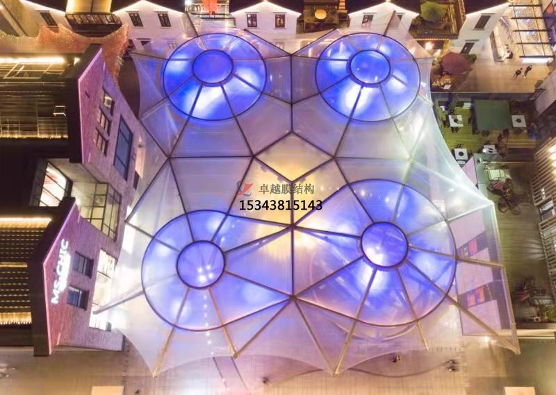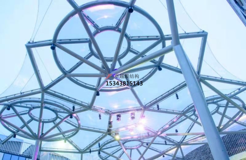 膜結(jié)構(gòu)的曲面造型與半透明特性,可模擬四季光影變幻,如某項(xiàng)目通過(guò)投影技術(shù)在天幕呈現(xiàn)沉浸式星空、森林等主題場(chǎng)景,成為網(wǎng)紅打卡地‌。