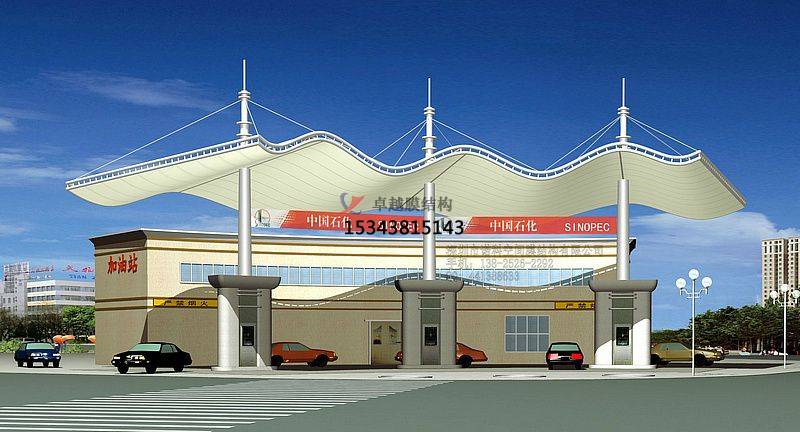 加油站罩棚是加油站的重要組成部分,設計加油站罩棚不僅僅要具有牢固、省電、防水等功能,還要美觀大方呢。膜結(jié)構輕巧、別致的造型在停車場及候車廳的建設中擔當了重要角色,除了滿足防風雨、防日曬等基本功能外,并有較好的標識招攬效果,展現(xiàn)了人們個性化的一面。