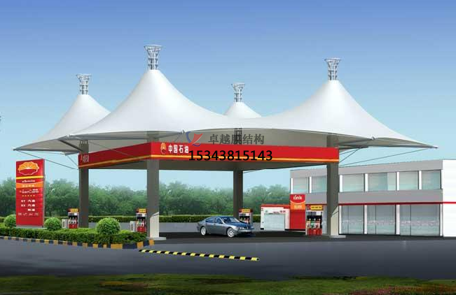 加油站膜結構運用在加油站頂蓬上是再合理不過的選擇,因為加油站的頂篷是公路或地區(qū)設置名稱標牌的主要位置,是公路或地區(qū)的重要標志;大跨度的膜結構在這種場 合下的運用,能充分體現膜結構的主要特點,并有較好的標識招攬效 果。為相關的道路或區(qū)域起到畫龍點睛的作用。