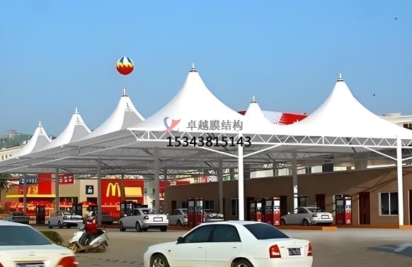 加油站張拉膜特點(diǎn):造型美觀,透光性好,節(jié)能環(huán)保,抗震性強(qiáng),施工便捷,經(jīng)濟(jì)性好。張拉膜結(jié)構(gòu)可通過獨(dú)特的曲面造型和豐富色彩,為加油站營造出現(xiàn)代、時(shí)尚的外觀,與周邊環(huán)境相融合,成為城市景觀的一部分。膜材具有較高的透光率,一般在 10%-20% 左右,部分可達(dá) 30% 以上,可提供自然采光,減少白天人工照明需求,節(jié)約能源。透光膜材可引入自然光減少照明能耗,結(jié)合自然通風(fēng)設(shè)計(jì)降低空調(diào)使用率,材料可回收性符合綠色建筑標(biāo)準(zhǔn),張拉膜具有良好的保溫隔熱性能,能有效降低加油站內(nèi)部能耗,配合節(jié)能照明設(shè)備,可實(shí)現(xiàn)綠色環(huán)保目標(biāo)。自重輕、柔性大,在風(fēng)荷載、雪荷載等外部荷載作用下,能通過變形分散荷載,具有良好的抗震性能,可抵抗 8 級(jí)地震。加油站膜結(jié)構(gòu)大部分構(gòu)件在工廠預(yù)制完成,現(xiàn)場組裝和安裝速度快,施工周期可比傳統(tǒng)建筑方式縮短一半以上,且對(duì)環(huán)境影響小,膜材料重量輕但強(qiáng)度高,降低支撐結(jié)構(gòu)負(fù)荷,安裝周期短,減少對(duì)加油站運(yùn)營的影響。張拉膜結(jié)構(gòu)廣泛應(yīng)用于加油站頂棚設(shè)計(jì),覆蓋加油區(qū)和洗車區(qū)域,為車輛及人員提供遮陽、防雨、防雪的全天候保護(hù)。在高速公路服務(wù)區(qū)、城市主干道等車流量密集區(qū)域,部分加油站結(jié)合張拉膜結(jié)構(gòu)擴(kuò)展服務(wù)功能,例如設(shè)置司機(jī)休息區(qū)、戶外餐飲區(qū)或小型便利店,通過靈活的空間布局提升用戶體驗(yàn),其高效覆蓋能力尤為突出。雖然膜材和鋼結(jié)構(gòu)等材料成本相對(duì)較高,但由于施工周期短、維護(hù)成本低,長期來看綜合成本具有優(yōu)勢,且使用壽命可達(dá) 15-30 年甚至更長。