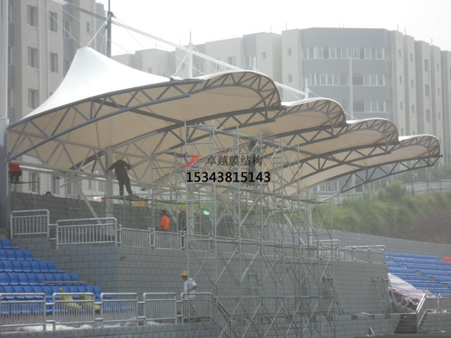 為了抵擋風(fēng)雪,膜面的外形應(yīng)使排水通暢使捷,避免在其上形成水兜或雪的堆積。在施加預(yù)應(yīng)力前的安裝成形階段,張拉膜結(jié)構(gòu)對這些荷載十分敏感。為了能將雨水排除,膜材和接縫須密封防水,膜邊緣也進(jìn)行特殊的細(xì)部設(shè)計(jì),以防止雨水進(jìn)入室內(nèi)。