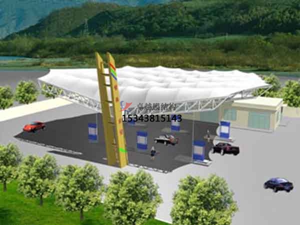 更后加氣站雨棚施工是由多種高強薄膜材料(PVC或Teflon)及加強構(gòu)件(鋼架、鋼柱或鋼索)通過一定方式使其內(nèi)部產(chǎn)生一定的預(yù)張應(yīng)力以形成某種空間形狀,作為覆蓋結(jié)構(gòu),并能承受一定的外荷載作用的一種空間結(jié)構(gòu)形式。結(jié)構(gòu)車棚的篷布材質(zhì)是膜結(jié)構(gòu),而膜材的更大特點是強度高、耐久性好、防火難燃、自潔性好,不受紫外線影響,使用壽命長,一般15-30年。具有高透光率,透光率為13%,對熱能反射率73%,熱吸收量很少。正是因為這種劃時代的膜材料的發(fā)明,使加氣站雨棚施工成為現(xiàn)代化的永久建筑。