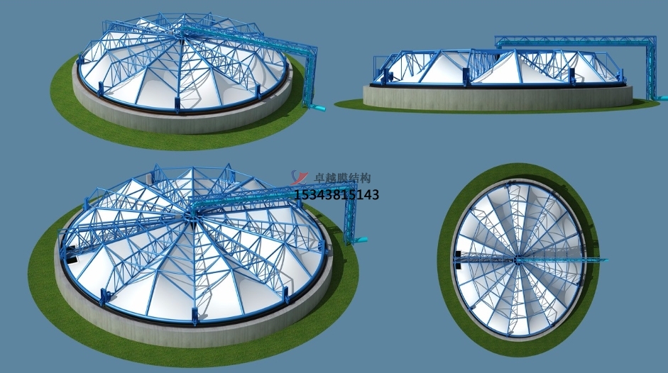 污水處理池加蓋,也稱反吊膜封閉,與常規(guī)建筑膜結(jié)構(gòu)不同之處在于,鋼構(gòu)在外部做支撐結(jié)構(gòu),膜材安裝在內(nèi)部做防護(hù)密閉,此類膜材采用污水池專用材料,具有防腐蝕、抗老化、免維護(hù)、美觀耐久、經(jīng)濟(jì)適用等優(yōu)點(diǎn)。