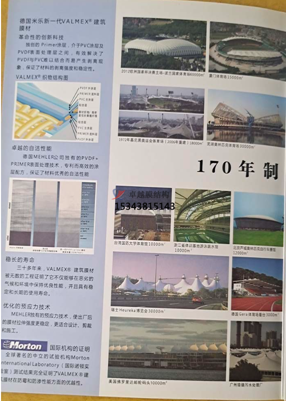 德國(guó)MEHLERHAKU米樂公司擁有165年(1837年一2003年)的制造業(yè)經(jīng)驗(yàn)。通過1S09001質(zhì)量體系認(rèn)證,所有產(chǎn)品均經(jīng)過嚴(yán)格的DIN德國(guó)工業(yè)標(biāo)準(zhǔn),以及各個(gè)國(guó)家的膜材工業(yè)標(biāo)準(zhǔn)。2002年,德國(guó)米樂公司獲聘為中華人民共和國(guó)建設(shè)部《索膜建筑結(jié)構(gòu)制品》行業(yè)標(biāo)準(zhǔn)編制委員成員。德國(guó)米樂的產(chǎn)品系列涵蓋環(huán)保等各種PVC膜材領(lǐng)域,包括:建筑工程、輕型結(jié)構(gòu)、廣告、遮陽(yáng)、汽艇、軍用、裝飾、水利環(huán)保,等等。