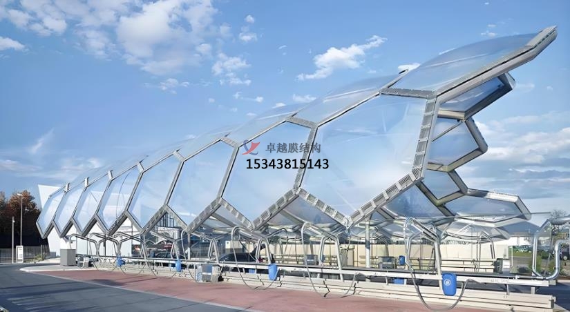 以下是膜結(jié)構(gòu)產(chǎn)品的主要應(yīng)用和特點(diǎn):膜結(jié)構(gòu)自行車(chē)棚和機(jī)動(dòng)車(chē)棚,膜結(jié)構(gòu)景觀,膜結(jié)構(gòu)污水池加蓋,膜結(jié)構(gòu)體育場(chǎng)館和展會(huì)建筑,膜結(jié)構(gòu)藝術(shù)裝置,膜結(jié)構(gòu)充電樁和收費(fèi)站。膜結(jié)構(gòu)自行車(chē)棚采用輕質(zhì)且堅(jiān)固的膜材料,具備優(yōu)異的抗風(fēng)、抗雨雪能力,同時(shí)具有自潔性,減少維護(hù)成本。其優(yōu)雅的造型和多樣的色彩選擇,使其成為城市中的一道靚麗風(fēng)景線,而機(jī)動(dòng)車(chē)棚的篷布采用PVC、PVDF、PTFE、ETFE等材料,具有高強(qiáng)度、耐久性好、防火難燃、自潔性強(qiáng)等特點(diǎn)。其透光率為13%,熱能反射率為73%,能有效減少熱吸收,使用壽命可達(dá)15-30年4。膜結(jié)構(gòu)景觀是一種耐用、高強(qiáng)度的涂層織物,具有柔韌的質(zhì)地、重量輕、透光性極佳等特點(diǎn),常被用于公園、廣場(chǎng)等場(chǎng)所,成為吸引眼球的藝術(shù)景觀。隨著工業(yè)污染的加劇,膜結(jié)構(gòu)污水池加蓋因其環(huán)保、施工簡(jiǎn)便等優(yōu)勢(shì),逐漸成為工業(yè)污水處理的首選。其鋼材料使用量少,能有效解決池體跨度過(guò)大的施工難題。膜結(jié)構(gòu)在體育場(chǎng)館和展會(huì)建筑中的應(yīng)用,不僅縮短了建設(shè)工期,降低了造價(jià)成本,還減少了環(huán)境污染。其大跨度的設(shè)計(jì)和高透光性,為場(chǎng)館提供了良好的采光和空間感。膜結(jié)構(gòu)藝術(shù)裝置設(shè)計(jì)簡(jiǎn)單、造型獨(dú)特,不僅具有藝術(shù)展示效果,還能為人們提供休息場(chǎng)所,廣泛應(yīng)用于公園、景區(qū)等場(chǎng)所。膜結(jié)構(gòu)充電樁和收費(fèi)站以其耐用性和美觀性,成為現(xiàn)代城市基礎(chǔ)設(shè)施的重要組成部分,為人們提供便捷服務(wù)的同時(shí),也大大提升了城市形象。