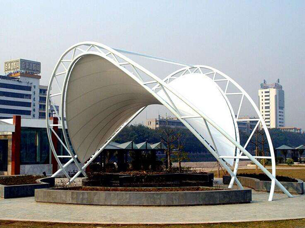 膜結(jié)構(gòu)是一種建筑與結(jié)構(gòu)完美結(jié)合的結(jié)構(gòu)體系。它是用高強度柔性薄膜材料與支撐體系相結(jié)合形成具有一定剛度的穩(wěn)定曲面,能承受一定外荷載的空間結(jié)構(gòu)形式。其造型自由輕巧、阻燃、制作簡易、安裝快捷、節(jié)能、易于、使用安全等優(yōu)點,因而使它在世界各地受到廣泛應用。這種結(jié)構(gòu)形式特別適用于大型體育場館、人口廊道、小品、公眾休閑娛樂廣場、展覽會場、購物中心等領域。