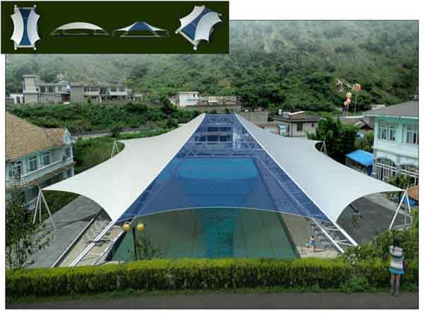氣膜游泳館使用的膜材都是由聚酯纖維和多層涂層復(fù)合而成,符合歐美及中國(guó)環(huán)保標(biāo)準(zhǔn),是一種具有強(qiáng)度,柔韌性好的薄膜材料;在力學(xué)上織物基材具有抗拉強(qiáng)度,抗撕裂強(qiáng)度,耐熱性,耐久性,防火性;涂層材具有耐候性,防污性,加工性,耐水性,耐品,透光性