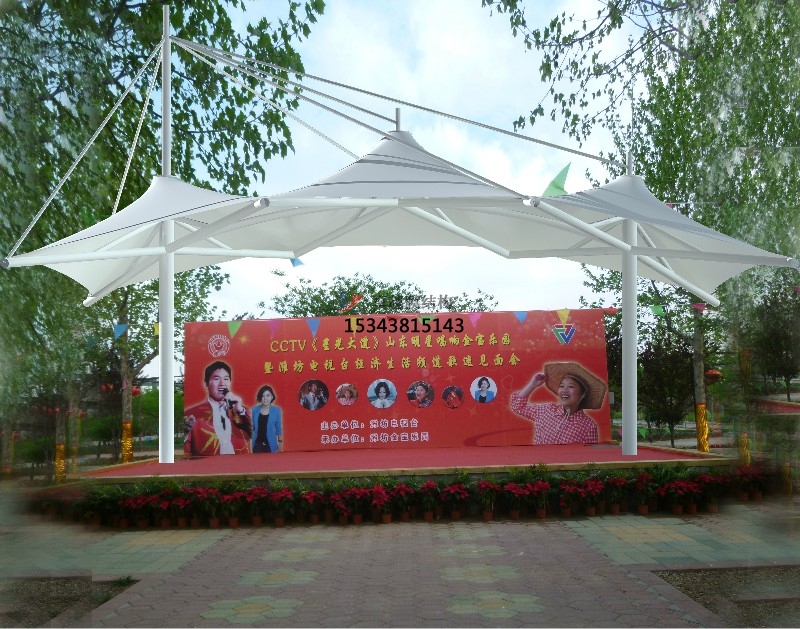 近年來(lái),隨著建筑空間觀念的日益深化以及科學(xué)手段的不斷提高,膜結(jié)構(gòu)已是現(xiàn)代建筑環(huán)境學(xué)發(fā)展的主流。它可以構(gòu)成單曲面,多曲面等不同建筑結(jié)構(gòu)形式,滿足了建筑師們對(duì)建筑與美學(xué)高度統(tǒng)一的要求。 由于膜材的光透性,白天陽(yáng)光可以透過膜材形成漫射光,使舞臺(tái)下如同自然,能很好地節(jié)約能源。夜間彩燈打射形成的絢爛景觀也讓市民體驗(yàn)到不一樣的感覺。膜材具有防水 性和遮陽(yáng)效果,而不受到日曬雨淋,因此膜結(jié)構(gòu)舞臺(tái)能創(chuàng)造出與自然環(huán)境相媲美的空間形式。