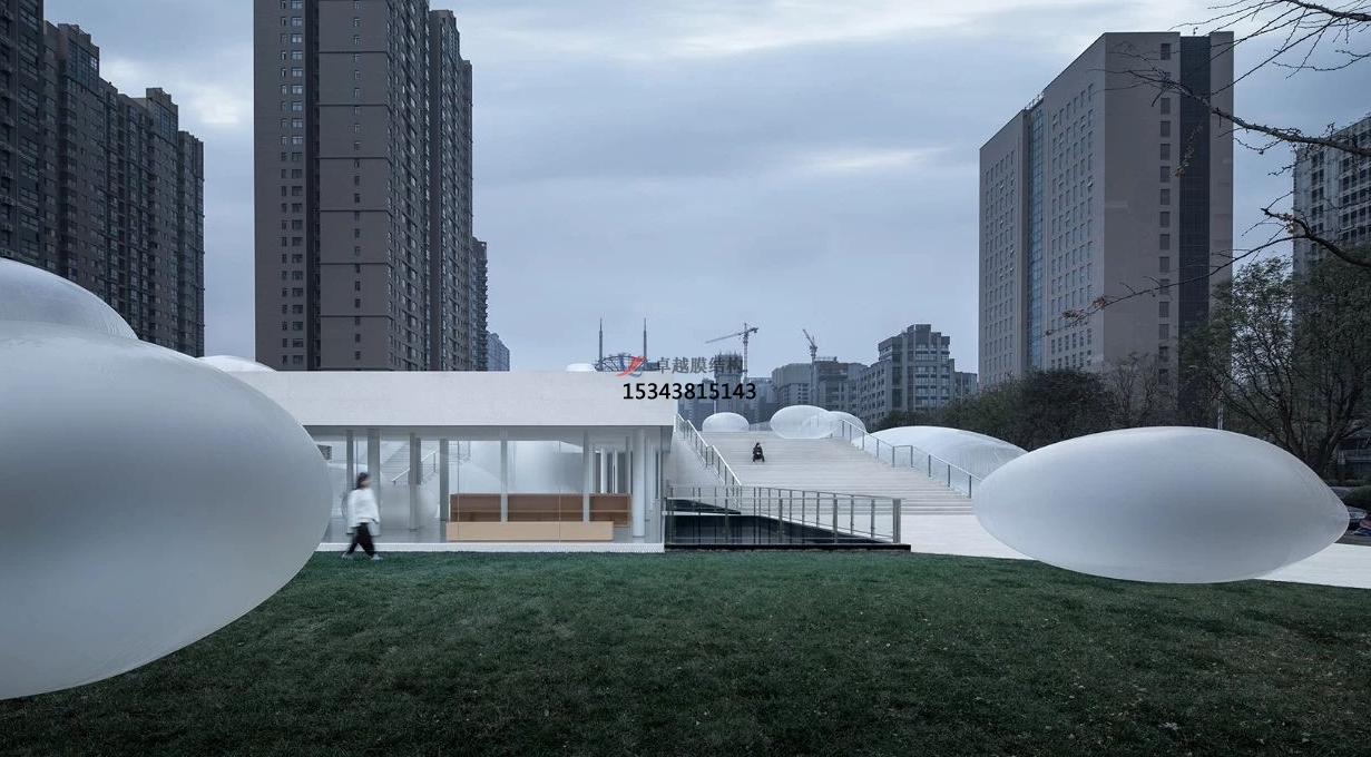 分為氣承式(整體氣壓支撐)與氣脹式(局部氣囊支撐)兩類。如某海灘餐廳項目采用32個橢圓形氣枕構(gòu)成1655㎡屋面,通過氣壓差維持結(jié)構(gòu)張力,配合六邊形印花實現(xiàn)動態(tài)遮陽。