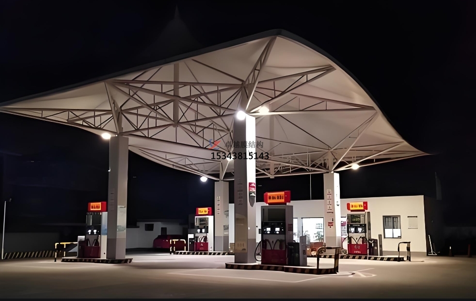 美觀與個性化:膜結(jié)構(gòu)頂棚設(shè)計靈活多樣,可根據(jù)加油站的整體風格與周邊環(huán)境,定制各種獨特的形狀和顏色。無論是流暢的曲線造型,還是富有現(xiàn)代感的幾何形狀,都能為加油站增添獨特魅力,提升其整體美觀度與辨識度,成為城市道路上一道亮麗的風景線。
