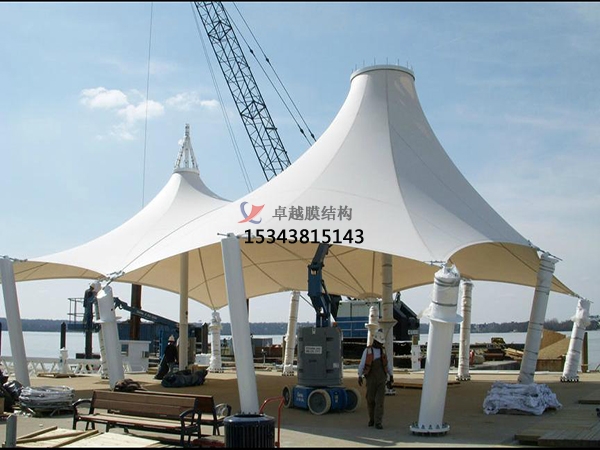 張拉膜結構則通過柱及鋼架支承或鋼索張拉成型。以膜材、鋼索及支柱構成,利用鋼索與支柱在膜材中導入張力以達安 定的形式。除了可實踐具創(chuàng)意,創(chuàng)新且美觀的造型外,也是能展現(xiàn)膜結 構精神的構造形式. 大型跨距空間也多采用以鋼索與壓縮材構成鋼索網(wǎng)來支撐上部膜材的形式。因施工精度要求]高,結構性能強,且具豐富的表現(xiàn)力,所以造價略高于骨架式膜結構。