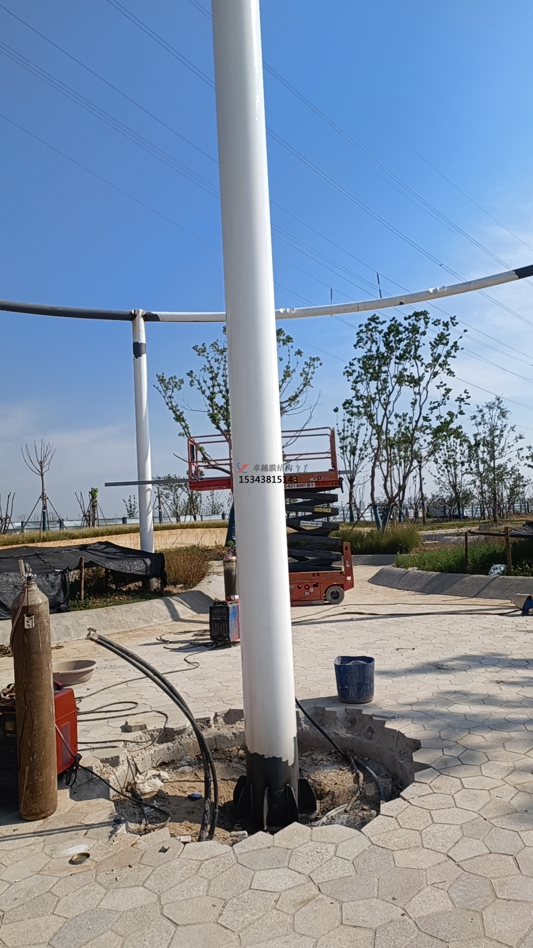 在支架和鋼絲繩安裝完成后,就可以開始安裝膜材料了。然后,用電動(dòng)葫蘆將膜材料吊起,將其拉緊并固定在鋼絲繩上。需要注意的是,膜材料的安裝要平整、美觀,不能有褶皺或扭曲的情況。
