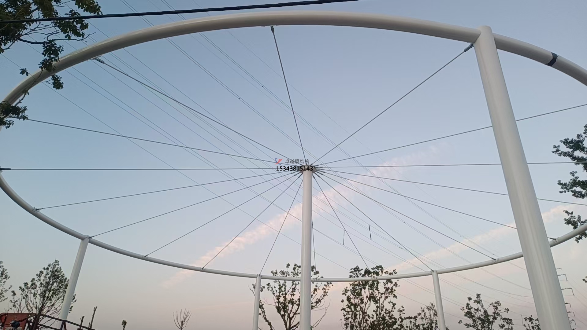 在支架上安裝鋼絲繩,用于固定膜材料。首先,要在膜材料上測量出鋼絲繩的長度和位置,并將鋼絲繩固定在支架上。然后,將鋼絲繩拉緊,并用電鉆將鋼絲繩固定在膜材料上。需要注意的是,鋼絲繩的拉力和固定方式要合適,不能太松或太緊,同時(shí)要確保鋼絲繩的安全性和穩(wěn)定性。