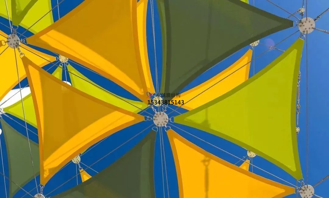 381網(wǎng)孔膜開孔度為4%,具有很好的遮陽透氣功效。Soltis92織物織就的明黃,明綠及暗綠的三角遮陽帆層層疊疊,在自然光及夜景燈光下非常好看。