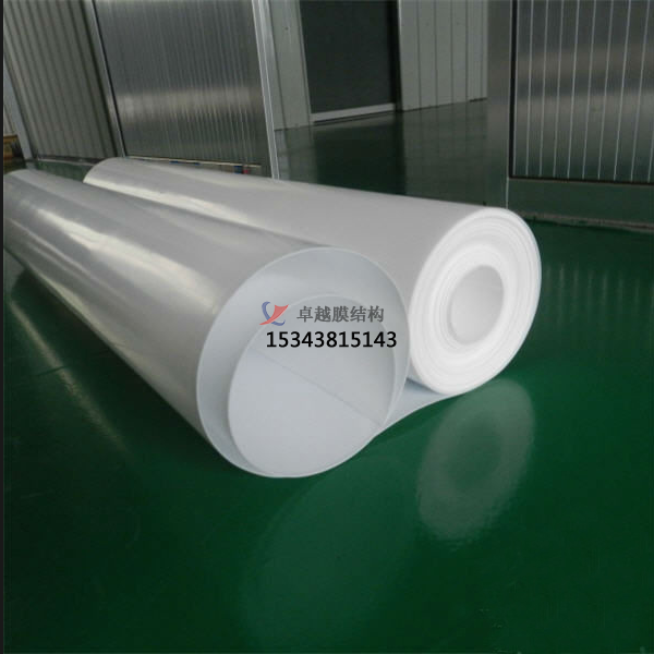 這種膜材有較好的焊接性能,有優(yōu)良的抗紫外線、抗老化性能和阻燃性能。另外,其防污自潔性是所有建筑膜材中較好的,但柔韌性差,施工較困難,成本也十分驚人。