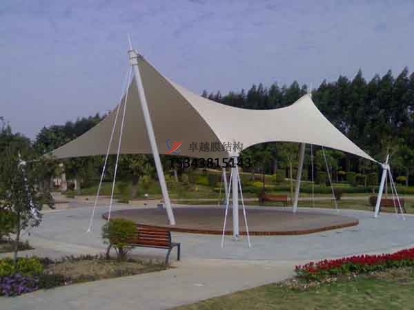膜結(jié)構(gòu)是一種由高強膜材料和強構(gòu)件(鋼結(jié)構(gòu)或拉索)通過一定方式使其內(nèi)部產(chǎn)生一定的張應(yīng)力以形成某種空間形狀,可作為覆蓋結(jié)構(gòu)并能承受一定的外荷載的空間結(jié)構(gòu)形式。膜結(jié)構(gòu)以良好的自潔性、隔熱性以及高強耐久、造型新穎、自重輕等優(yōu)點廣泛應(yīng)用于休閑小區(qū)、輕型大跨度無柱空間或輕型屋蓋建筑結(jié)構(gòu)。