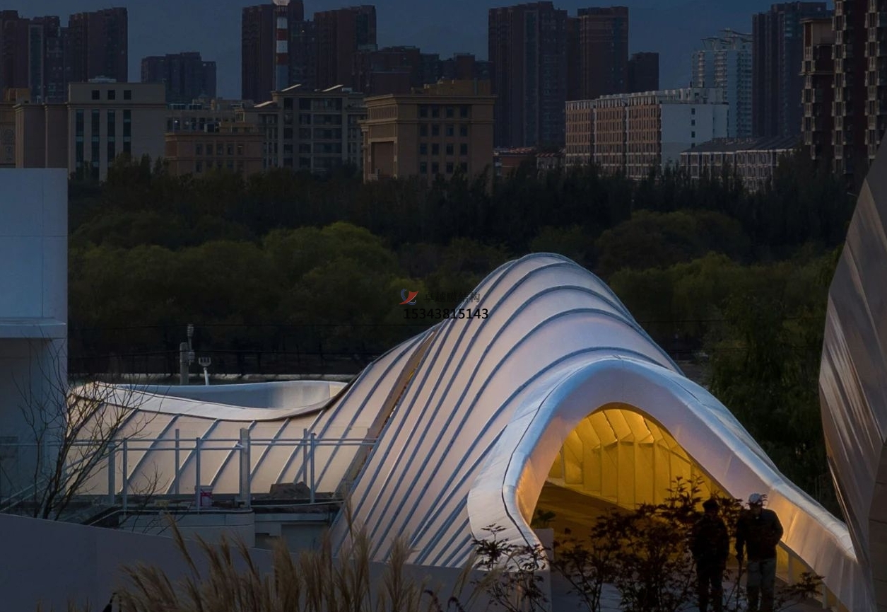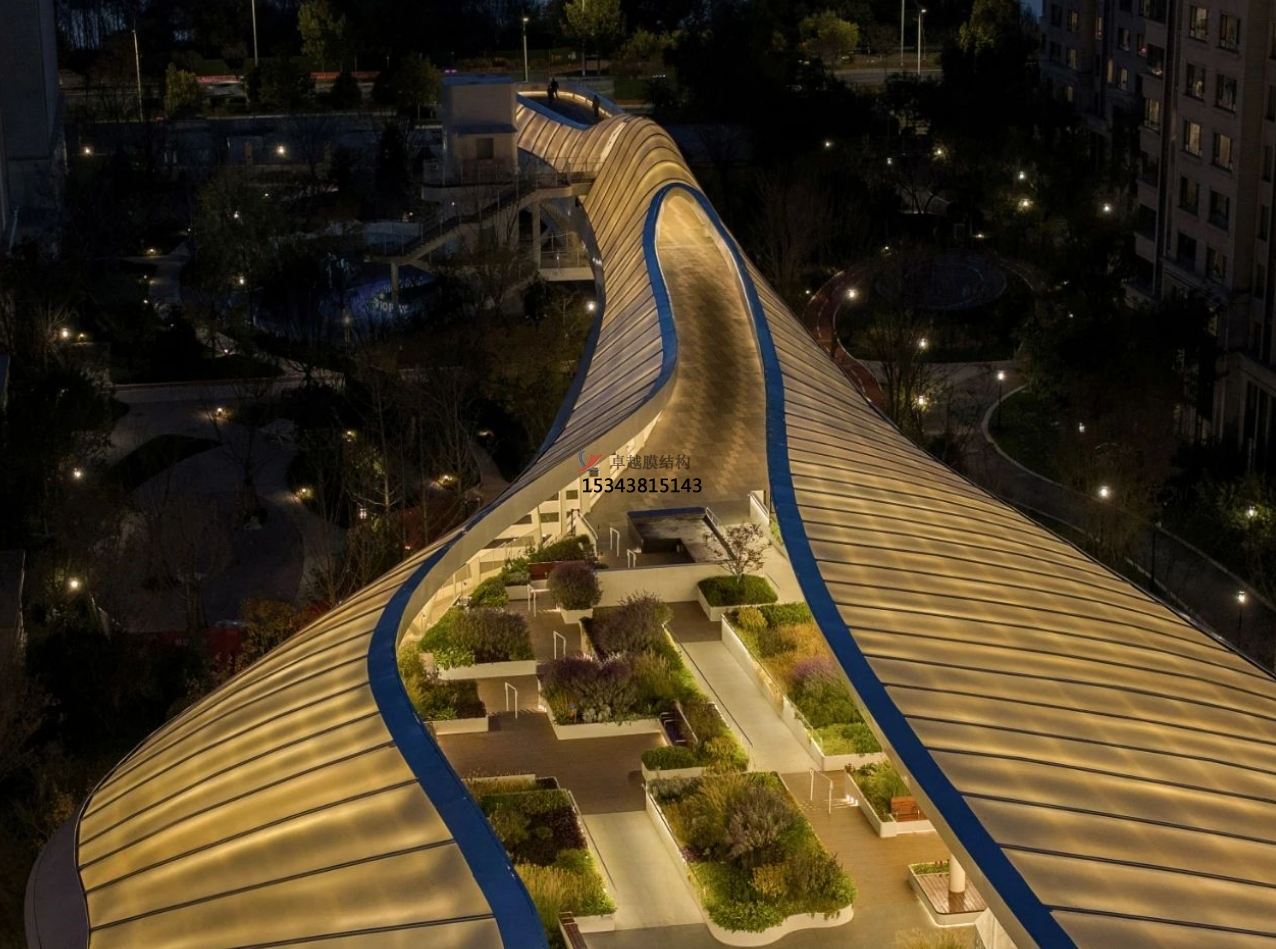 該半透明法拉利進口PTFE膜材,遮陽防水,自然采光,既可以保證日間二層屋頂花園能夠有充分光照,夜間也可利用膜的反射來提供屋頂花園的照明功能需求。