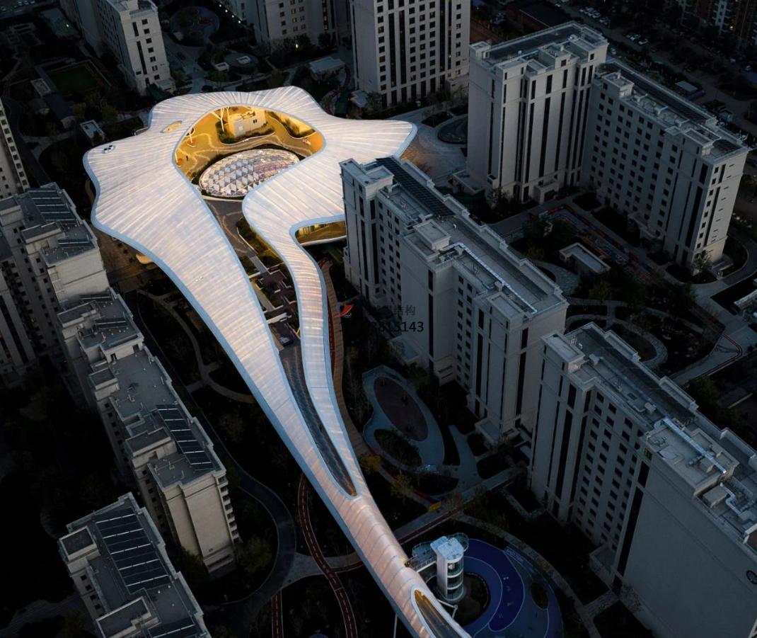 相對于四周規(guī)則的建筑形態(tài),活力中心呈現(xiàn)更加自由和充滿活力的有機形態(tài):如一顆水珠滴落,在場地中激起漣漪,自中心散開、升騰,形成一片白色、柔軟的云朵,最終轉(zhuǎn)化為自由的大屋頂。