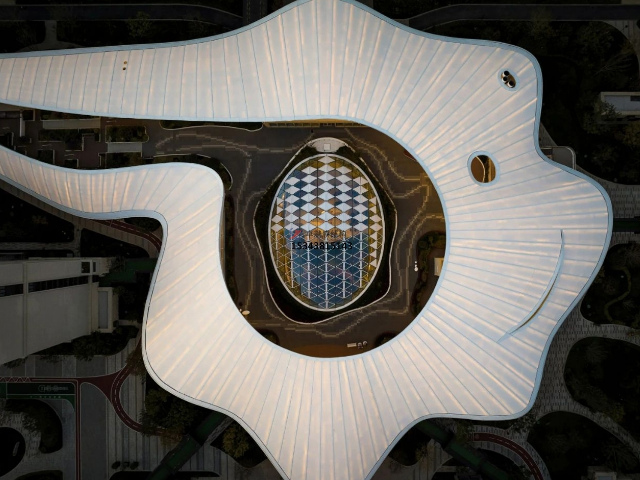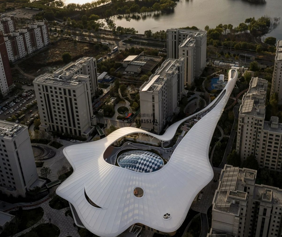 活力中心建筑屋頂是曲面膜屋面(中間高并向四周逐漸降低),選用法拉利進口PTFE膜材,猶如漂浮的云朵將建筑體輕輕覆蓋。