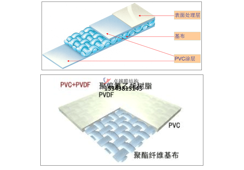 PVDF膜材加工是在聚酯纖維基布上涂上Pv(聚氬乙烯)樹酯后加上100%PVDF(聚偏氟乙烯)表面涂層而成的復合材料。PVDF膜權由于自潔性良好、價格適中、運輸安裝方使,更廠泛應用于各類建筑領域。它的壽命因不同的表面涂層而異,一股可達成10-25年,其構造形式見下圖: