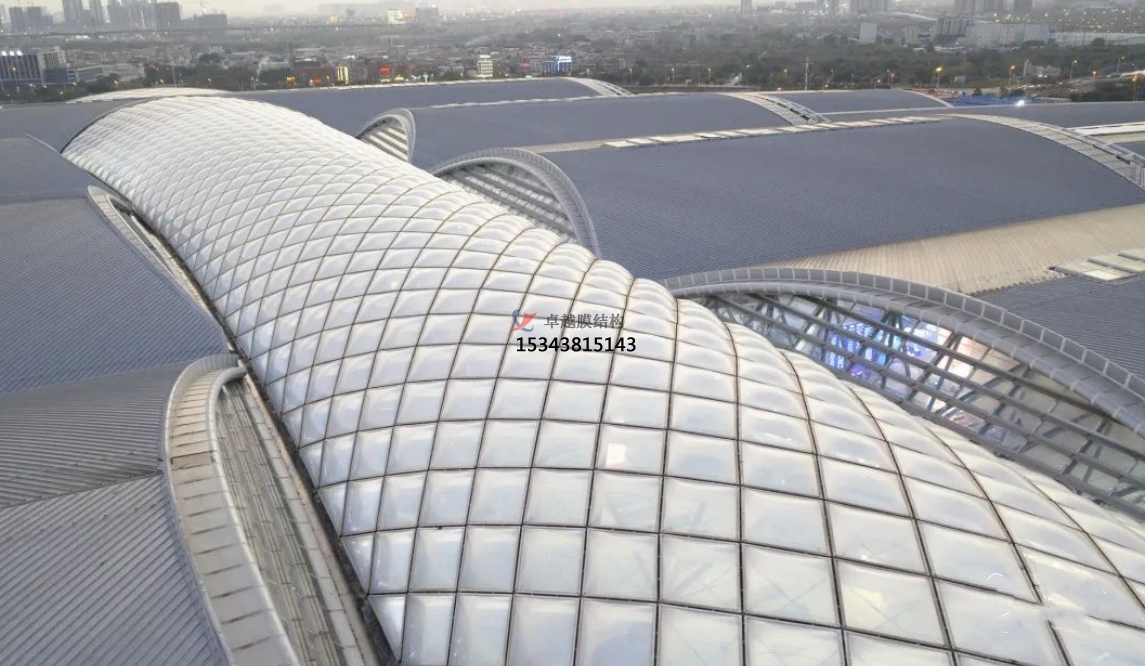高鐵站膜結構是一種新型的建筑結構形式,它采用高強度柔性薄膜材料與支撐體系相結合,通過一定的技術手段,使其內(nèi)部產(chǎn)生一定的預張力,從而形成具有一定剛度和穩(wěn)定性的空間結構體系。這種結構形式具有重量輕、跨度大、造型美觀、施工速度快等優(yōu)點,能夠滿足高鐵站大空間、大跨度的建筑需求。