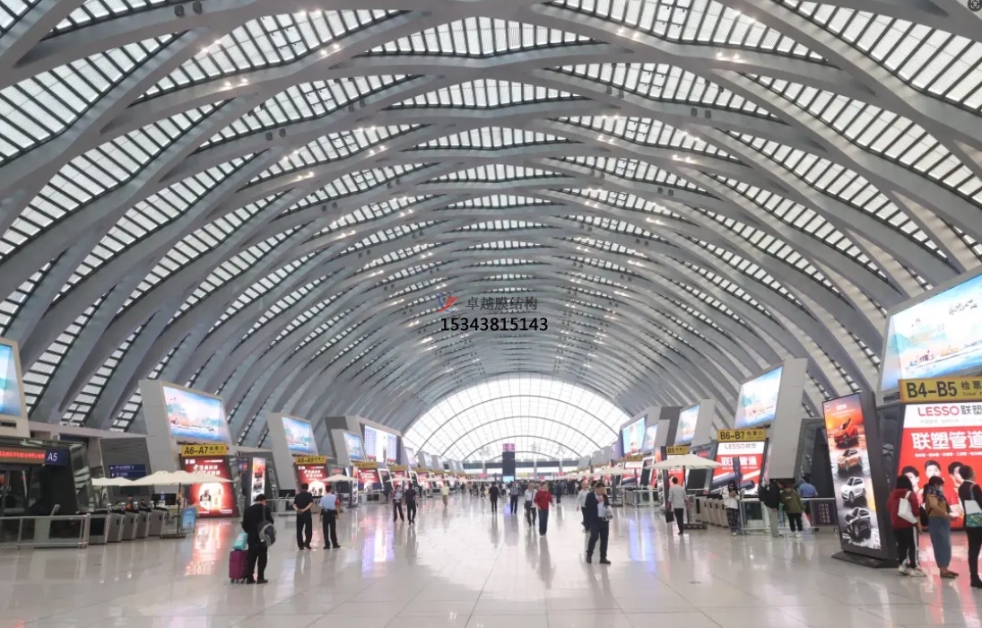 在機(jī)場(chǎng),膜結(jié)構(gòu)被廣泛應(yīng)用于航站樓的各個(gè)部位。例如,機(jī)場(chǎng)的到達(dá)和出發(fā)遮陽(yáng)蓬、候機(jī)樓內(nèi)的膜結(jié)構(gòu)吊頂?shù)龋疾捎昧四そY(jié)構(gòu)技術(shù)。這些膜結(jié)構(gòu)不僅為旅客提供了舒適的候機(jī)環(huán)境,還通過(guò)其獨(dú)特的造型和透光性,將陽(yáng)光過(guò)濾成柔和的散射光源,營(yíng)造出溫馨而明亮的氛圍。