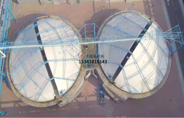 雙膜密封罩結(jié)構是污水池上加蓋的一個氣囊,它由上下兩層氟碳纖維膜焊接而成,通過周邊與污水池池壁錨固,形成一個穩(wěn)定的受力結(jié)構,起到污水池內(nèi)惡臭氣體密閉的效果。雙膜密封罩結(jié)構的優(yōu)點是結(jié)構牢固、密封性好、防止水溫升高或降低,適用于工業(yè)水曝氣池或市政污水池。