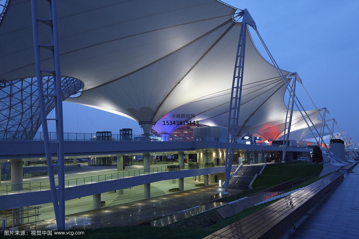 (2 )輕巧而美觀的膜結(jié)構(gòu)用于敞開或半敞開建筑物的遮蔽屋蓋尤為適宜。近年來在足球、田徑等比賽的體育場(chǎng)中,越來越多的看臺(tái)挑蓬都采用膜結(jié)構(gòu)。國外很多露天劇院的舞臺(tái)、博覽會(huì)的展覽館也都以膜材作為頂蓋。在我國廣大地區(qū)的農(nóng)貿(mào)市場(chǎng)也可大力推廣膜結(jié)構(gòu)。