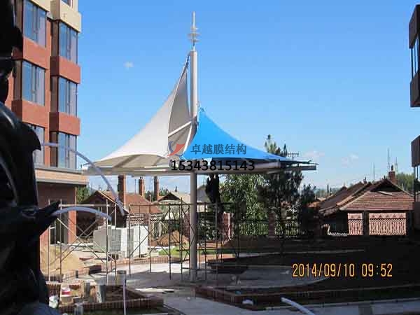 一個城市的中心區(qū)反映一個城市的地理風貌和民族風情,同時,也是一個城市文化發(fā)展程度的標志。而景觀設計要求其具有廣泛的可讀性、雅俗共賞,既有超凡脫俗的藝術價值,又能使大眾喜聞樂見與大眾息息相通。膜結構以其輕盈飄逸的造型、柔美并帶有力量的曲線和大跨度和大空間的鮮明個性和標識性,應用于城市小品設計中。