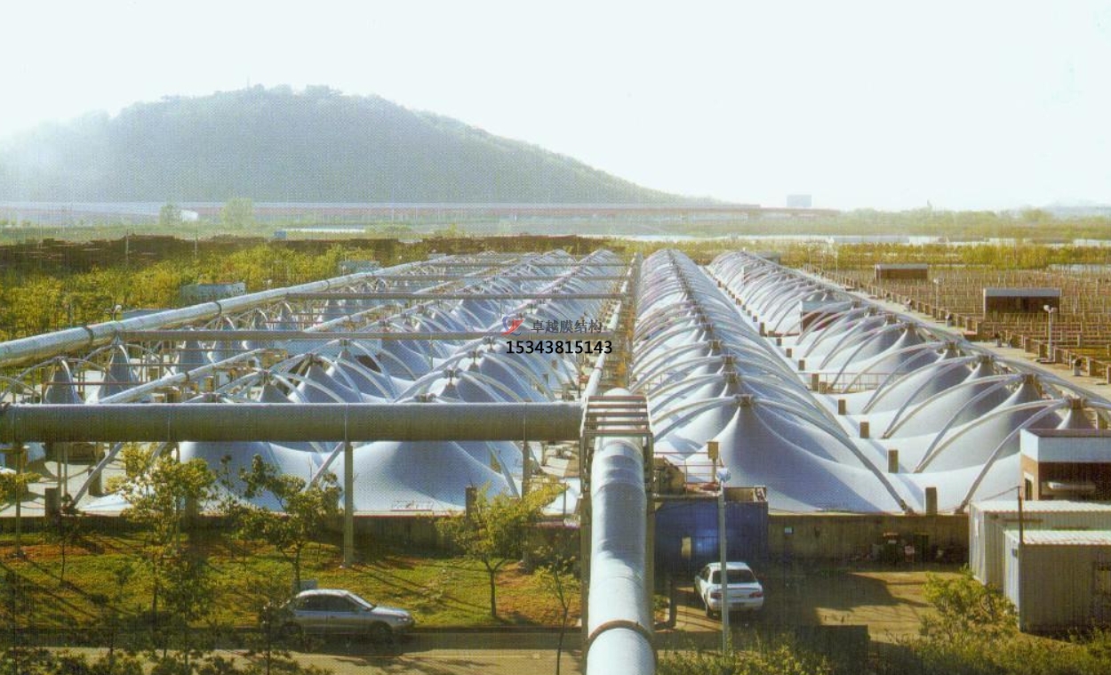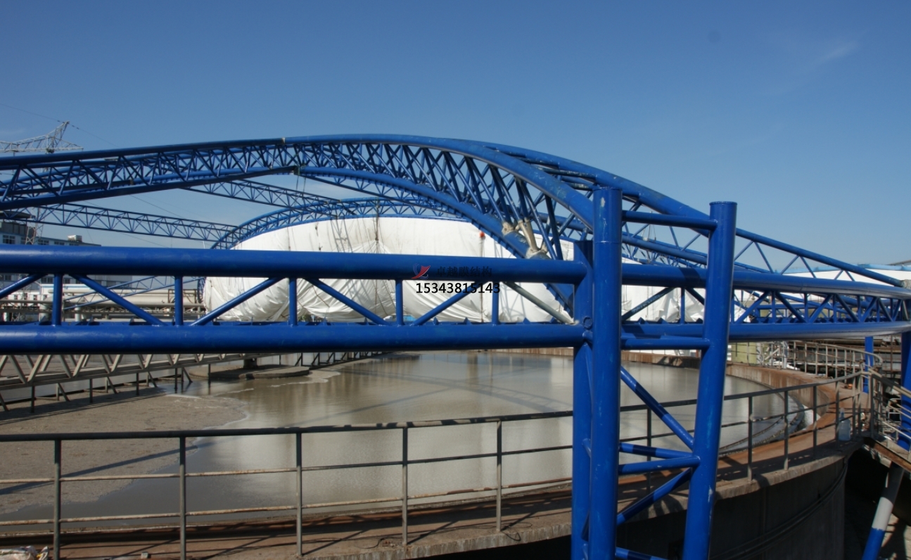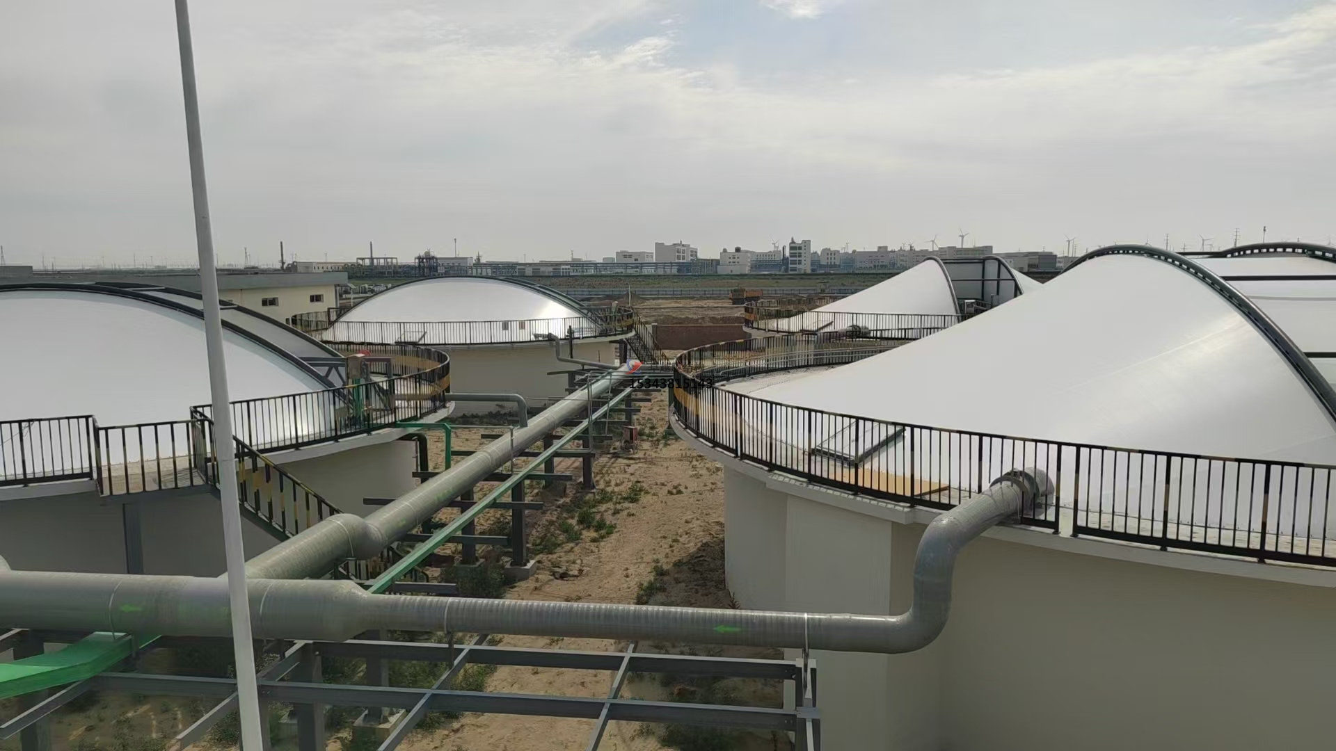 污水池反吊膜,顧名思義,是一種將薄膜材料以反吊的方式覆蓋在污水池上方的結(jié)構(gòu)。這種結(jié)構(gòu)通過鋼架或索網(wǎng)等支撐體系,將膜材料緊繃并固定于污水池上方,形成一個密閉或半密閉的空間,有效隔絕污水池內(nèi)的惡臭氣體和有害物質(zhì),防止其對外擴(kuò)散,同時保護(hù)膜材料免受污水池內(nèi)腐蝕性氣體的侵蝕。