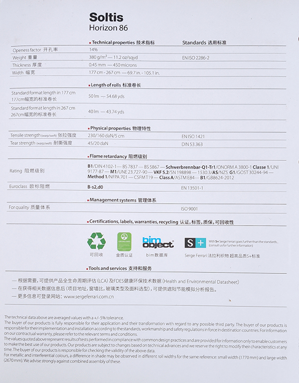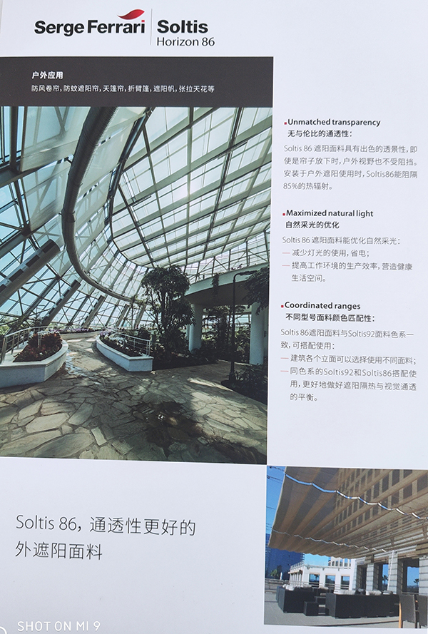 紗帝飾:紗帝飾面料為抵擋熱量和光線的真正盾牌,依靠其微型通風(fēng)結(jié)構(gòu),調(diào)節(jié)陽光的熱效應(yīng),有效地防眩目。紗帝飾面料具有46種顏色,可為所有建筑,無論是 公眾場合還是私人住宅提供配套的眾多色彩和多種用途。法拉利預(yù)應(yīng)力專利制造技術(shù)給紗帝飾織物帶來尺寸恒定,不會變形,無需加固自然抗撕拉,耐久和抗塵,占 地面積小等獨有特性,更顯出紗帝飾面料對建筑物技術(shù)性遮陽無可匹敵的優(yōu)勢。