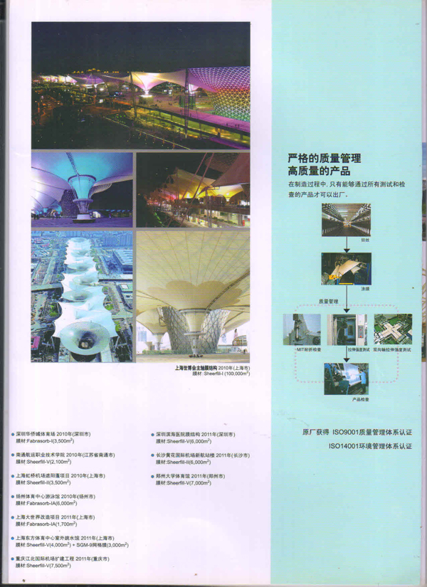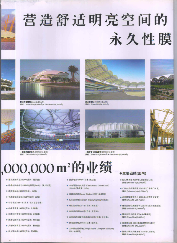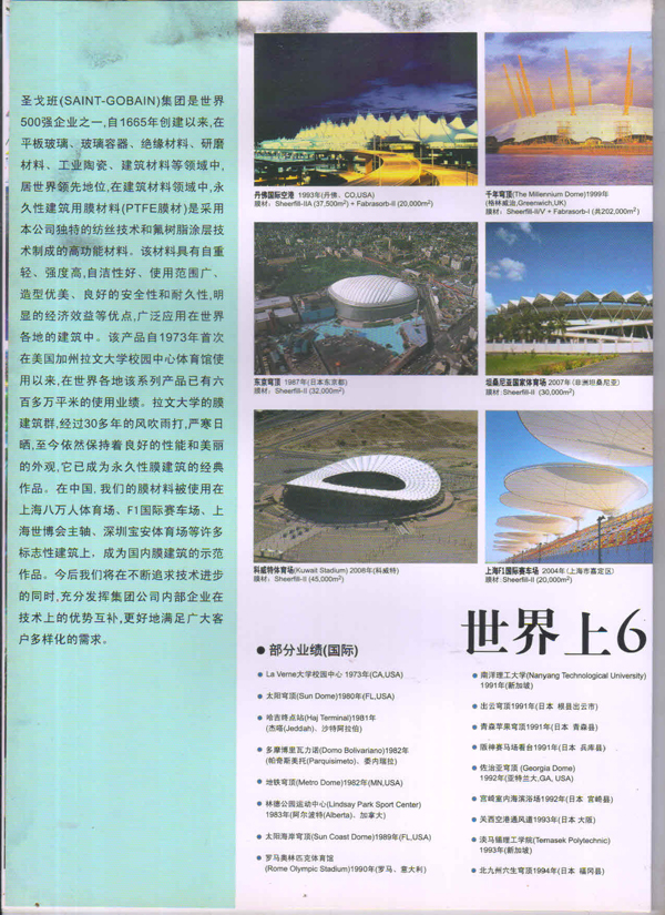 圣戈班工業(yè)薄膜為市場(chǎng)提供高性能聚合物薄膜、微孔過(guò)濾膜、薄膜圖層、復(fù)合薄膜和壓敏膠帶等多種產(chǎn)品近40多年,在相關(guān)行業(yè)中具有領(lǐng)先的地位。在諸多建筑中,我們都能看到圣戈班的影子,其中就有被很好的建筑師青睞的PTFE的建筑膜,實(shí)際上它就是圣戈班SHEERFILL®建筑網(wǎng)格布。