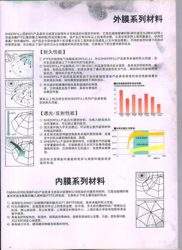 SHEERFILL產(chǎn)品能夠在-70C到+230C的溫度范團(tuán)內(nèi)安全使用。具有良好的耐熱性、耐濕性、耐藥品性等特性,即使在承受了暴風(fēng)雪這類(lèi)惡劣天氣后,膜結(jié)構(gòu)仍然能維持初始狀態(tài),膜材料不會(huì)產(chǎn)生松弛。